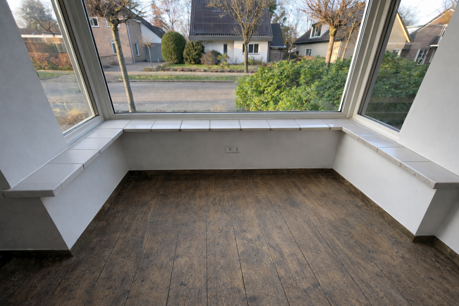 Bij dit project in Apeldoorn is de complete erker vernieuwd. Wij hebben een nieuwe natuurstenen vloer geplaatst, de vensterbanken op maat gemonteerd en een strakke afwerking rondom de kozijnen verzorgd. Het resultaat: een moderne en luxe uitstraling.